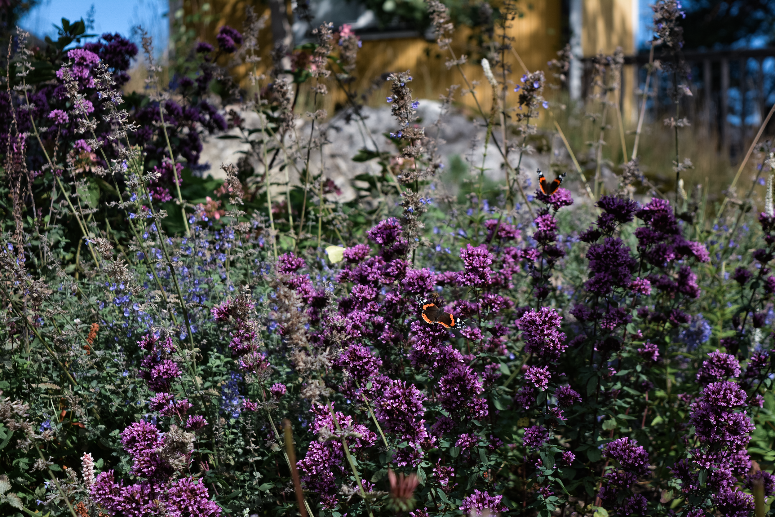 Genom att återanvända sprängstenen från husbygget skapades stenmurar som både löste nivåskillnaderna och gav plats för planteringar. Den hårda ytan förvandlades till en blommande entré där perenner, gräs och buskar nu bildar ett levande stråk. Resultatet blev inte bara funktionellt och estetiskt – utan också en ny livsmiljö för humlor, fjärilar, fåglar och allt det myller som gör jorden rik.