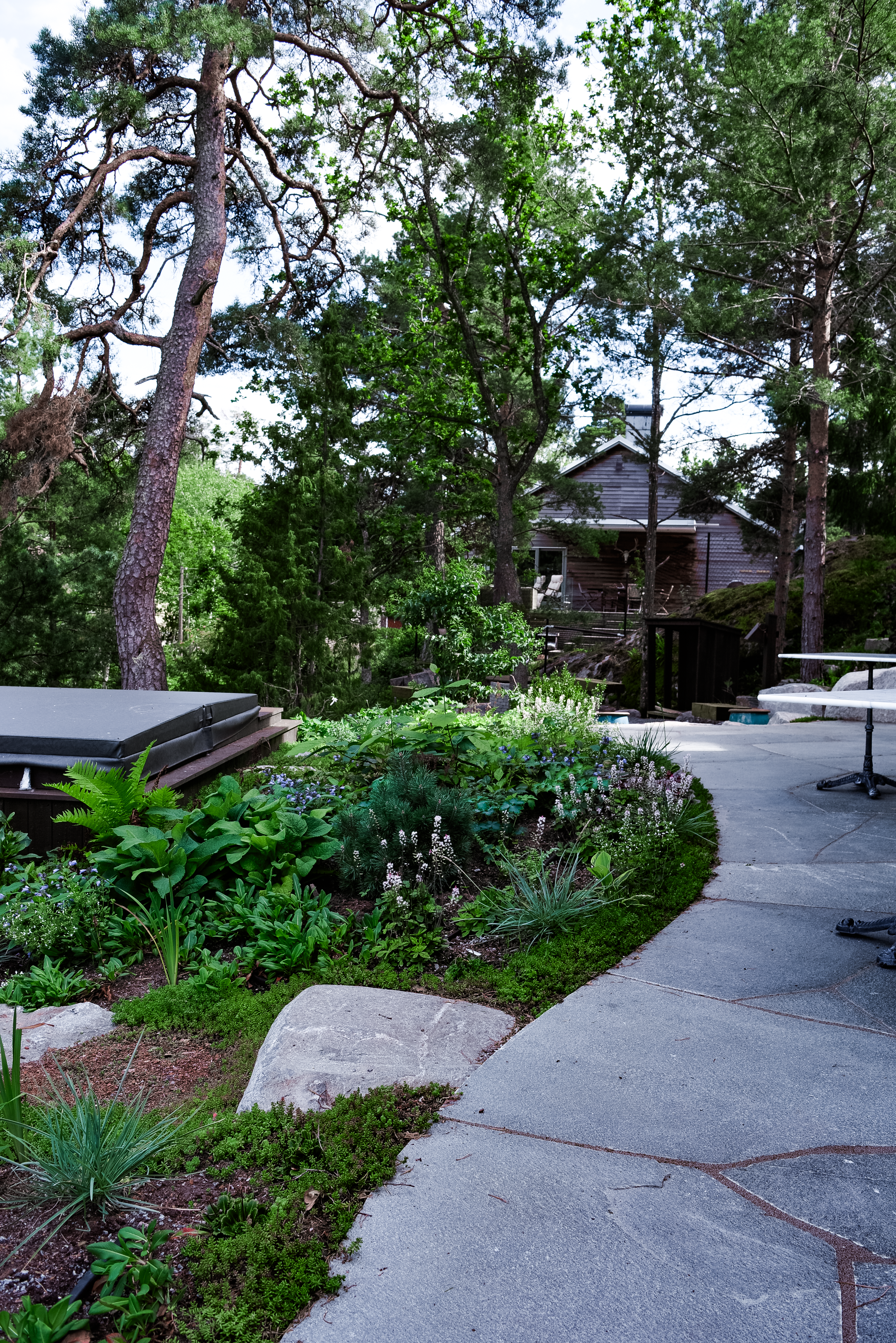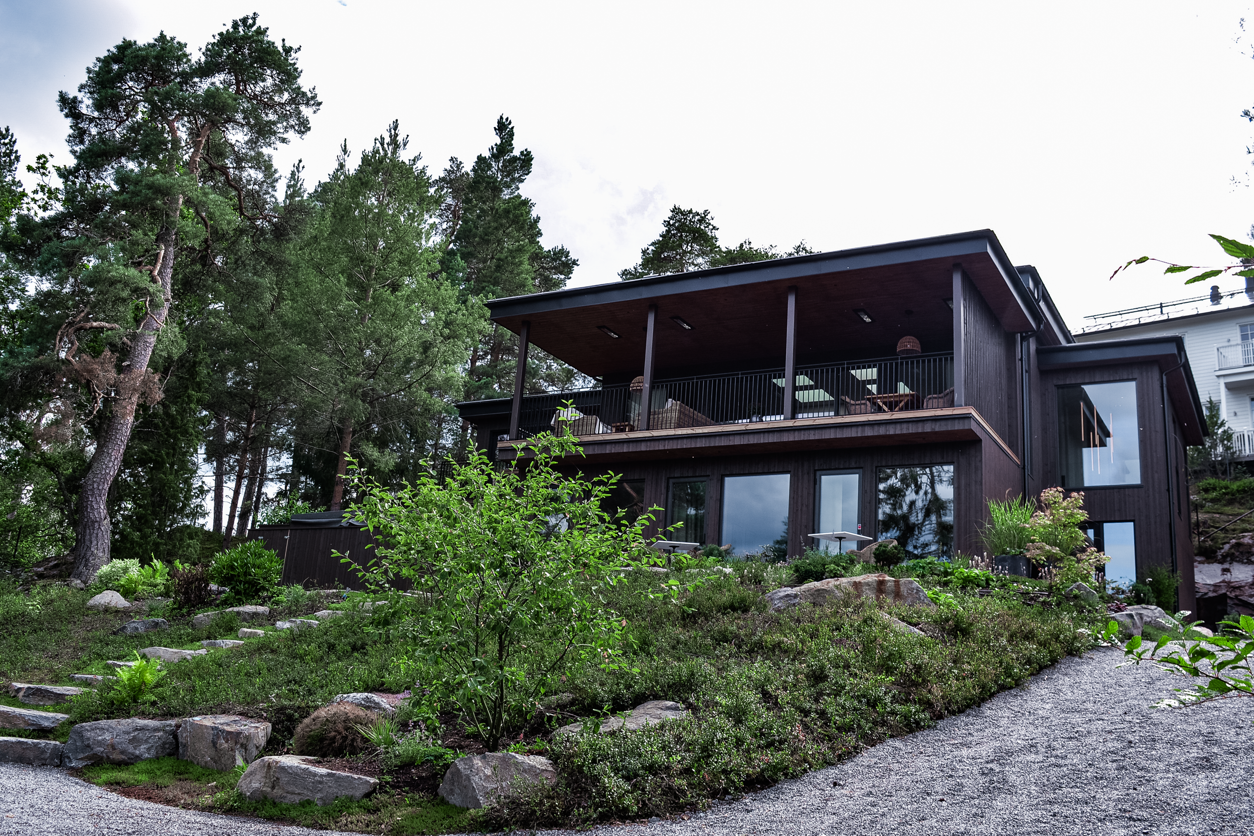 På en sluttning med utsikt över Baggensfjärden växte våren 2025 ett modernt hus fram – omsorgsfullt placerat bland tallar och berghällar i den orörda skogen. Visionen var att låta arkitekturen och trädgården smälta samman med naturen och bevara den särpräglade karaktären i landskapet. Utgångspunkten blev att skydda så mycket som möjligt av den befintliga vegetationen och skapa en trädgård som känns som en naturlig fortsättning av skogen omkring, utan att för den delen göra avkall på familjens behov av funktion och användbarhet.